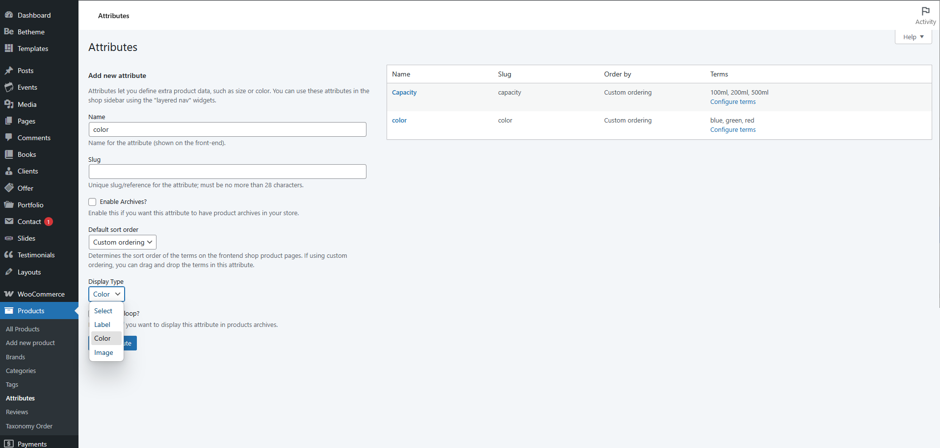 - Podczas dodawania nowego atrybutu (np. "Kolor", "Pojemność" czy "Okładka"), zwróć uwagę na pole Display Type.
